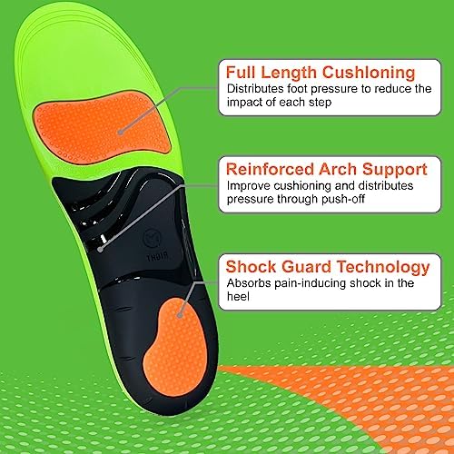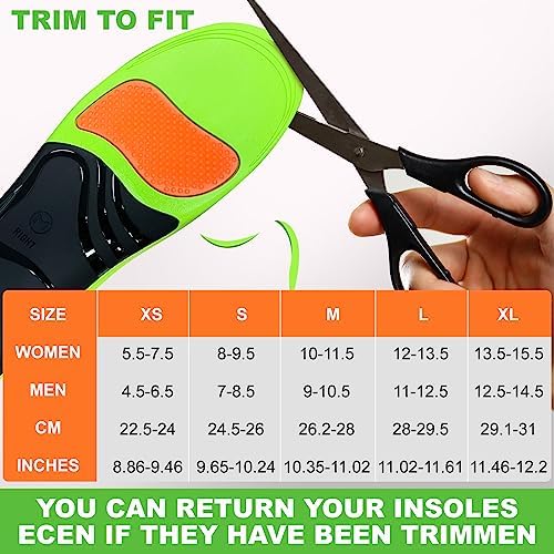 【PREMIUM QUALITY METERIALS】These arch support insoles have multiple layers of cushioning materials, featuring a hard plastic orthotic insert made of extra-hard TPU, cushioning PU foam layer, and high-grade dampening gel pads for stability and excellent shock absorption while engaging in athletic activities. The soft, velvety, and breathable cover reduces heat and friction, keeping your feet cool, dry, and odor-free during strenuous activities