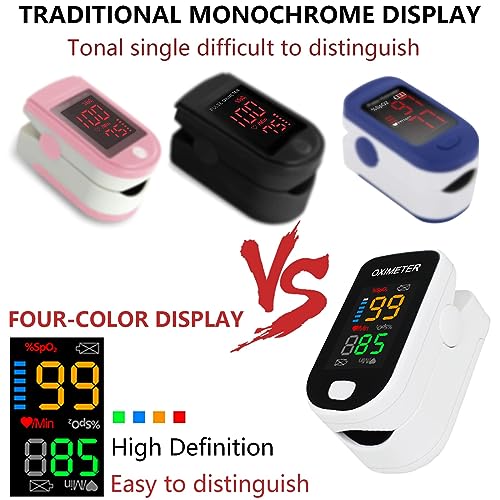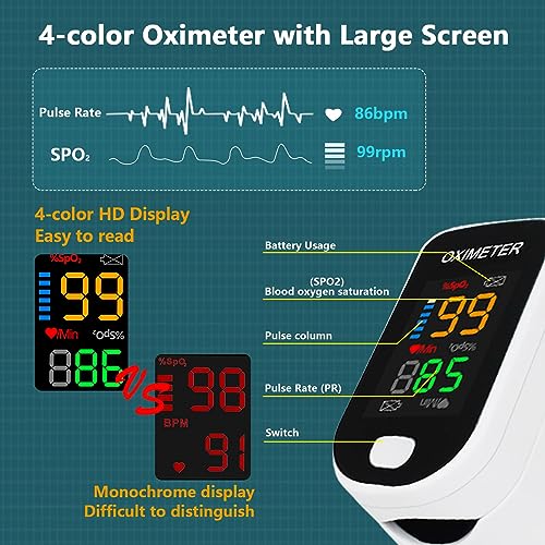 【Large screen HD reading】Oximeter is equipped with 4-color HD LED large screen, color screen is easier to read the parameter values. Therefore it has backlight function and can read clearly in outdoor sunlight or in the dark.