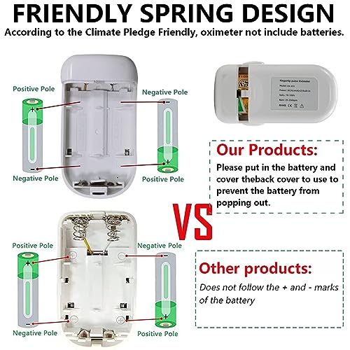【Friendly spring design】Oximeter battery compartment is better than other oximeter same side spring design solution, our device use two end spring design, you can easily put in the battery according to the spring direction, and not because of the same side spring put in the wrong direction of the battery cause not to turn on.