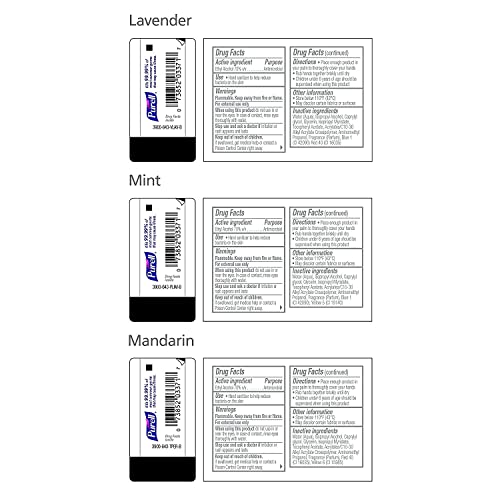 Case Includes 8 – PURELL Advanced Hand Sanitizer Essentials, Infused with Essential Oils – 1 fl oz in three fragrances: (3) Mandarin, (3) Lavender, and (2) Mint bottles. Due to high demand, included JELLY WRAP Carriers may vary in color