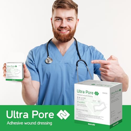 Medrull is trustable brand with a wide assotiment of hight quality medical products. Top-Quality Hospital Supplies – A MUST HAVE FOR ANY HOUSE! Available in 4 different sizes and you can choose soft non woven or waterproof material. Medrull Soft sterile flexible Non-Stick wound dressing plasters Ultra Pore 4 x 4 self-adhesive, absorbent made from soft non woven material and is designed for low to moderately exuding wound, such as surgical wounds, cuts and abrasions. Skin friendly adhesive provides a gentle but secure fixation. Made from an elastic non-woven material backed with a non irritating latex free adhesive this dressing does not adhere to the wound, which reduced any risk of damage during dressing removal. Very flexible – easy to apply on difficult areas like hands, elbows and knees. Protect a wound, reducing the risk that infectious. Box with individually wrapped 25 bandages. Border 4″x4″ (10 cm x 10 cm) is fit for wounds within 2″x2″ (pad size).