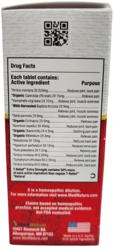 Active Ingredients: Each tablet contains: *Arnica montana 3X224mg, *Calendula officinalis 2X 15mg, *Hamamelis virginiana2X 15mg, *Wild-Harvested Baptisia tinctoria 2X 9mg, *Bellis perennis 2X 9mg, *Echinacea 2X 9mg, *Aconitum napellus 3X45mg, *Chamomilla 2X 4.5mg, *Millefolium 2X 3mg,*Belladonna 3X 12mg, *Hypericum perforatum 3X 12mg, *Ruta graveolens 3X 1.5mg, *Arnica montana 4X 0.32mg,*Symphytum officinale 6X 0.36mg, *Arnica montana 8X 0.09mg.T-ReliefTMExtra Strength contains 50% more of each medicine than regular T-Relief.*Natural Ingredients Inactive Ingredients: Dextrose, Magnesium stearate, Maltodextrin