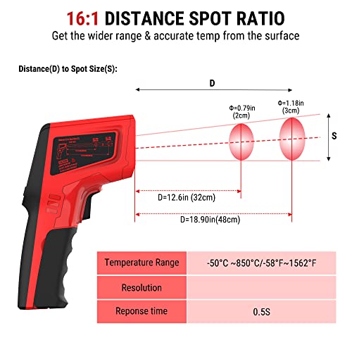 Highly Accurate and Adjustable Emissivity: DSR 16:1 laser temp gun thermometer for cooking takes temperatures in longer and safer distances than those DSR 8:1 or 12:1; With 0.1 to 1.0 adjustable emissivity, the pyrometer ensures accuracy highly up to ±1.5%