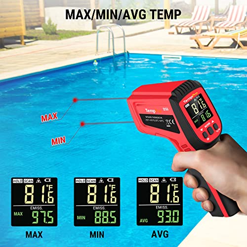 Wide Monitor Range: The infrared ir heat temperature gun ranges from -58°F to 1022°F, making it perfect for measuring the temperature of various materials that are dangerously hot or cold; Easily monitor the Max temperature with the MAX/MIN/AVG temp display function