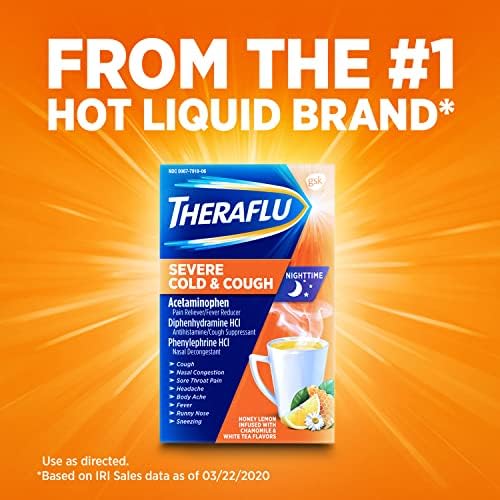 Theraflu Nighttime Severe Cold and Cough Hot Liquid Powder Honey Lemon Infused with Chamomile and White Tea Flavors brings the heat to fight your worst cold and cough symptoms with each power-packed dose. It helps fight nasal congestion, cough, body aches, sore throat pain, sinus congestion, sneezing, runny nose, headache, and fever. Dissolve a single packet of delicious honey lemon, chamomile and white tea flavored powder into hot water to help relieve worst cold symptoms. Can be taken every four hours, while symptoms persist. Do not take more than 5 packets in 24 hours unless directed by a doctor. This medicine is intended only for adults and children 12 years of age and over. Theraflu Nighttime Severe Cold and Cough Hot Liquid Powder Honey Lemon Infused with Chamomile and White Tea Flavors brings the heat to fight your worst cold and cough symptoms with each power-packed dose. It helps fight nasal congestion, cough, body aches, sore throat pain, sinus congestion, sneezing, runny nose, headache, and fever. Dissolve a single packet of delicious honey lemon, chamomile and white tea flavored powder into hot water to help relieve worst cold symptoms. Can be taken every four hours, while symptoms persist. Do not take more than 5 packets in 24 hours unless directed by a doctor. This medicine is intended only for adults and children 12 years of age and over.