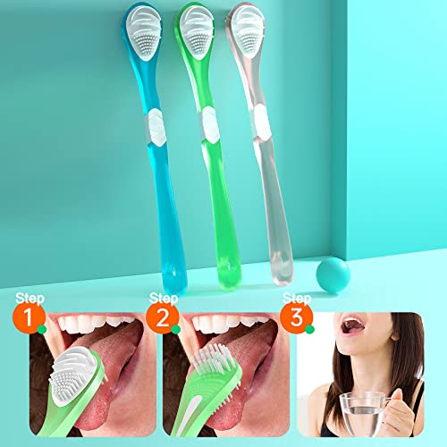 DOUBLE-SIDED SILICONE TONGUE BRUSH – FAST CLEANING, GREAT FOR SENSITIVE TONGUES: Tongue scraper on one side has dual bending friction with massage texture, five arc scraping surface, scraping once equal to five times, gently removing food debris that causes bad breath coating. the other side comes with ultra-soft micro-pointed bristles, gently bringing debris to the tongue surface. double-sided cleaning is more thorough, fast, and efficient.