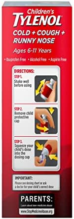 Intended for kids 6 to 11 years of age, Children’s Tylenol Cold + Cough + Runny Nose Oral Suspension provides temporary relief from a range of cold and flu symptoms, including minor aches and pains, sore throat, runny nose, sneezing, and cough. The formula of this liquid cold medicine also temporarily reduces fever and starts working fast. Each 5-milliliter dose of this children’s medicine contains 160 milligrams of the pain reliever and fever reducer acetaminophen, 1 milligram of the antihistamine chlorpheniramine maleate, and 5 milligrams of the cough suppressant dextromethorphan HBr. This kids’ cold, runny nose, and cough syrup also comes in a kid-friendly grape flavor and is ibuprofen-free, alcohol-free, and aspirin-free, so it’s gentle on the tummy. From the #1 pediatrician recommended brand for pain & fever relief, Tylenol has been used by parents decade after decade.