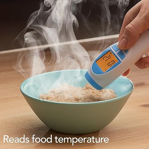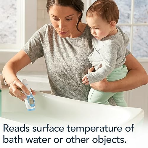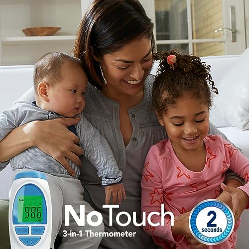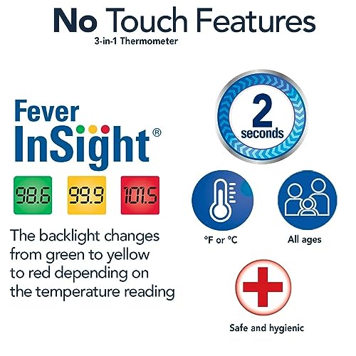 Advanced Technology for Excellent Performance: Goodbaby Thermometer is backed by clinical validated and recommended by the pediatrician. Fast and Easy Temperatures Readings: Taking your family’s temperature with this digital thermometer is as simple as pointing, and pressing a button. It uses infrared technology and can show readings in Celsius or Fahrenheit. Multi-mode Thermometer: The digital thermometer is designed for all ages, adults, infants, and elders. It not only supports the forehead function but is able to take room/object temperature. Reliable and Accurate: Our forehead thermometer has been clinically tested and found to be a fast and absolutely reliable gadget to use. It is ideal for forehead readings and has a very small error margin.The screen displays GREEN for a normal temperature, YELLOW for an elevated temperature, and (RED) for a high temperature. Clinically Proven No Touch Convenience Minimize the struggle or stress of temperature taking with instant, accurate forehead readings. Recommended for infants, children and adults. Safe and hygienic Avoid transferring germs with no touch readings. Forehead, Object or Liquid Measurement Reads temperature at the center of the forehead, food, bath water or other objects. Thermometer, 3-in-1, No Touch Contents: Vicks No Touch Thermometer; 2 AAA Alkaline Batteries. New! Professional accuracy. 2 Seconds. Measures forehead, food and bath temperatures. Reads in degrees F or degrees C. 3-in-1: 98.6; 99.5; 101.5. Fever InSight feature. The screen displays Green for a normal temperature, Yellow for an elevated temperature, and Red for a high temperature. Clinically Proven No Touch Convenience: Minimize the struggle or stress of temperature taking with instant, accurate forehead readings. Recommended for infants, children and adults. Safe and Hygienic: Avoid transferring germs with no touch readings. Forehead, Object or Liquid Measurement