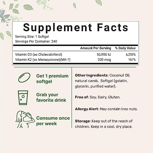 Each pouch offers 240 easy-to-consume mini coconut oil infused softgels. A potent once per week complex that provides natural sunshine vitamin synergy. 50,000 iu Vitamin D3 and 200 mcg vitamin K2 per dose.