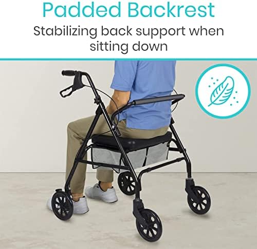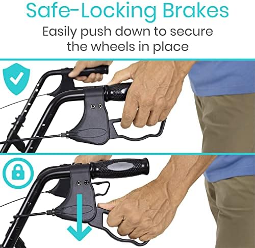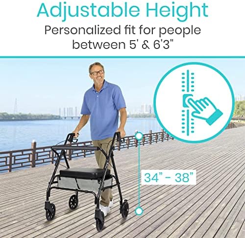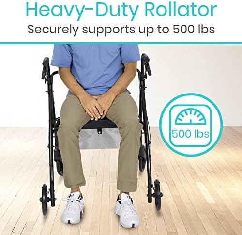 STRONG STEEL FRAME: Safely supporting up to 500 pounds, the Vive bariatric rollator is made with a durable steel frame that requires minimal, tool-free assembly. The heavy-duty rollator handles are also height-adjustable between 34” to 38” for a customized fit.