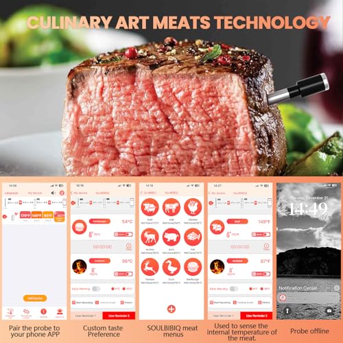 【BLUETOOTH GRILL THERMOMETER & INSTANTLY ALERTS REMINDER】— The smart meat thermometer wireless allowing you to enjoy a carefree cooking experience. Audible and visual reminders hear reminders from the charging hub speaker as well as App notifications to ensure you don’t miss a thing. A smarter and simpler App SoulBIBIQ,suitable for use in the oven,BBQ,pan-frying,air fryers, or sous vide cooking. your smartphone will beep to remind you, never overcook!