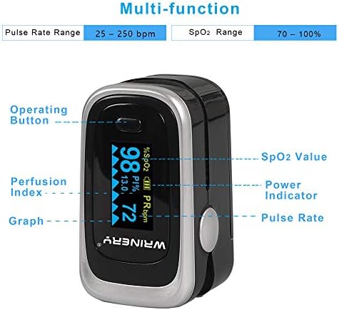 WRINERY Oxygen Saturation Monitor, Pulse Oximeter Fingertip, Oxygen Monitor, O2 Saturation Monitor, OLED Portable Oximetry with Batteries, Lanyard (Royal Black-Silver)