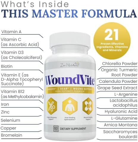 Zen Nutrients WoundVite Pre & Post Surgery Support, Scar & Wound Care, Scar Treatment, Plastic & General Surgery, Heal Faster & Aids in Recovery Time w/ Bromelain, Turmeric & Arnica – 60 Vegan Caps