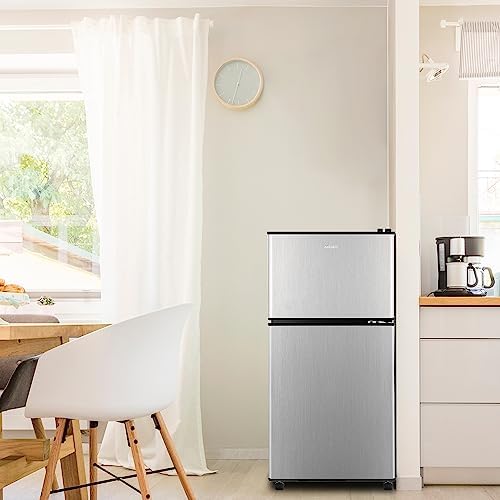 Anukis Compact Refrigerator 3.5 Cu Ft 2 Door Mini Fridge with Freezer For Apartment, Dorm, Office, Family, Basement, Garage, Silver