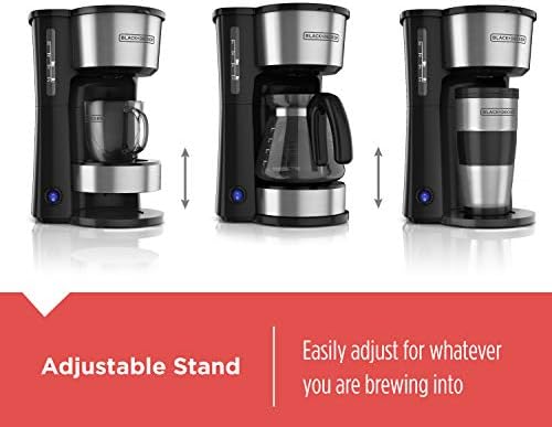 Choose your brew! This 4-in-1 coffeemaker brews into a standard mug, a tall travel mug, a 5-cup* carafe, and it works for pour over coffee. The adjustable stand allows for brewing versatility, and the unique, removable brew basket lets you control the strength of your coffee when making a pour over into a mug or carafe. The improved carafe is designed for comfortable handling and drip-free pouring, and the lid is removable for easy cleaning. Plus, you get a 14-oz. stainless steel travel mug for taking your coffee to go. Due to the multi-functionality of this unit, a carafe hot plate is not included. *Cup equals approximately 5 ounces (varies by brewing technique) Black+Decker and the Black+Decker logo are trademarks of The Black & Decker Corporation and are used under license.
