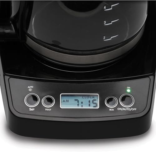 Get your morning Caffeine fix with the caress mini drip Coffee maker. With a black base and stainless steel accents, It comes with a glass carafe with brew-through lid, and a permanent gold tone filter. The drip-free pouring spout and ergonomic handle makes it comfortable to hold and easy to pour without messy spills. It also features an internal water level indicator as well as programmable 24-hour timer and clock with digital LCD display. A coated non-stick warming plate keeps your Coffee hot for two hours and the machine automatically shuts off after two hours. Backed by a manufacturer’s one year limited, This drip Coffee maker is sure to guarantee satisfaction.
