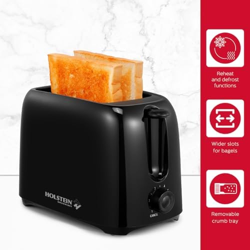 The Holstein Housewares 2-Slice Toaster is the perfect way to start your day with six timed browning settings, reheat, defrost and cancel functions. Plus, the extra-wide toasting slots accommodate bagels and thick cuts of bread. The Holstein Housewares 2-Slice Toaster is your perfect ally for breakfast, so get your butter ready!