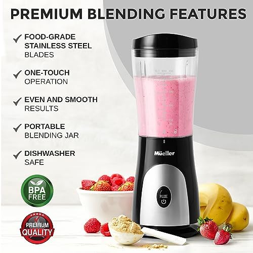 Mueller Personal Blender for Shakes and Smoothies with 15 Oz Travel Cup and Lid, Juices, Baby Food, Heavy-Duty Portable Blender & Food Processor Black