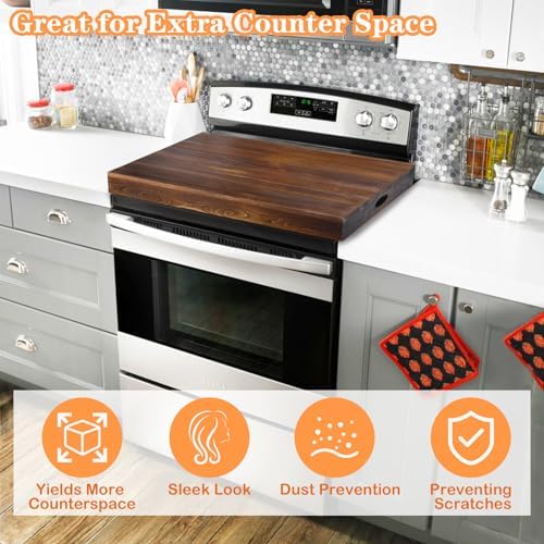 【Wooden Stove Top Cover Board】The stove top cover cover is made of natural pine wood to ensure its quality and durability, the wood is pretty thick and sturdy that you can use it as a wooden cutting board or chopping board and no worry about scratching cooktop. Fit for most standard stoves, such as gas stove burners, electric stove and glass stove top. Great for extra counter space and protects your expensive stove top as well. Fits flat stovetop perfectly and adds a nice clean look for your cooktop.