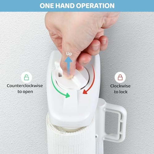 【Easy One-Hand Operation】One-handed operation allows you to open and close while holding your child. The Retractable baby gate can be used in a simple two-step operation. Lift up first, then turn the switch counterclockwise to unlock the door, and turn the switch clockwise to lock the door.