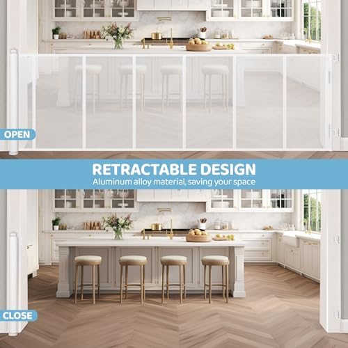 【Retractable Design】Retractable baby gate can extend up to 120″(300cm) wide and 33″(85cm) high, the baby gates for doorways is designed to adjust to any door/stair width up to 120″. Be sure to measure the width of your doorways before purchase to make sure it fits. The baby gate for stairs is equipped with an aluminum alloy roll mandrel for smoother retraction. When not in use, the mesh can be fully retracted without disassembly, saving you home space.