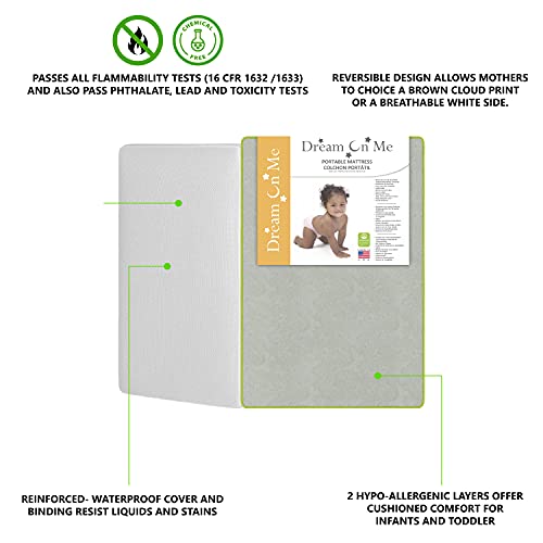 Designed with smaller homes and apartments in mind, the The Dream On Me 2-In-1 Breathable Two-Sided 3″ Portable Crib Mattress is compact in size but packs a punch with its handy features. Designed to fit standard size portable/mini cribs, this made-in-the-USA mattress is Greenguard Gold certified and meets/exceeds all flammability (16 CFR 1632/1633) standards. The Dream On Me 2-In-1 Breathable Two-Sided 3″ Portable Crib Mattress comes with a firm 3” fiber core that is wrapped in two CertiPUR-US certified layers, offering the perfect blend of support and comfort. It features a reversible design: a white infant side covered with breath flow material and a green toddler side with a waterproof cover and lockstitch binding that keeps out liquids and stains, creating hygienic & safe sleeping conditions. The Dream On Me 2-In-1 Breathable Two-Sided 3″ Portable Crib Mattress guarantees the freshest sleeping surface thanks to its unique breath flow as well as the reinforced mattress cover. It weighs 8 Lbs. Safety Advice: Please ensure mattress covers or fitted sheets are not too tight or loose over a crib mattress to practice safe sleeping. Flip/rotate mattress every 2-3 months Designed to fit standard size portable/mini cribs.