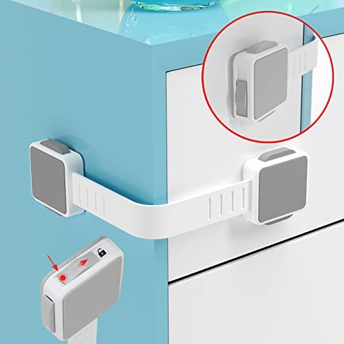 2 Pack Baby Proofing Safety Locks for Cabinet Drawer Fridge Oven Dishwasher Doors, Toilet Seat & Lid, Adjustable Furniture Latches and Straps, 3M Adhesive No Drilling and Button Unlock Design