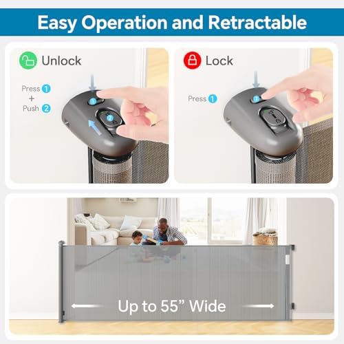 【Easy Operation Retractable Gate】Easy to use with just one hand, simply press and push the button to lock and unlock the safety gate, even when you’re holding your baby or carrying toys and diapers, baby gate is 42″ tall and can openings up to 55″ wide, and retracted away when not in use, saving space
