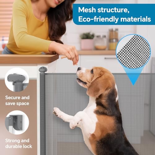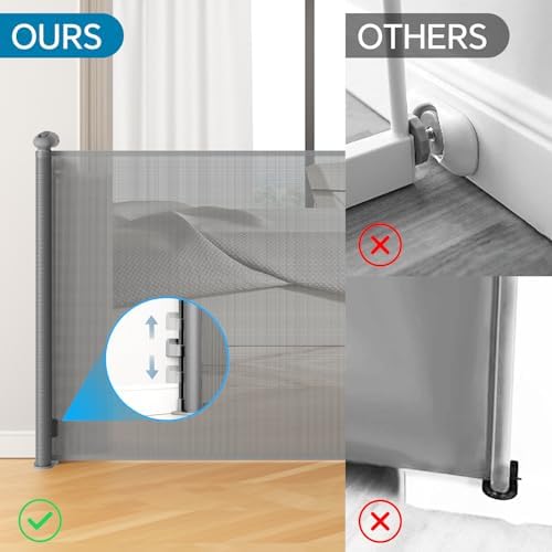 【Retractable & Durable Mesh Dog Gate】Keep pets out of specific areas, such as the kitchen, dining or bedroom. Mesh area is taut,sturdy,scratch-resistant and anti-climb. Avoid the baby or dog to crawl through underneath the baby gate, mounting bracket is adjustable that fit the height of your wall skirting board