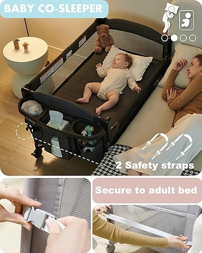 【✨UPGRADE 4 IN 1 |BEDSIDE SLEEPER+CHANGING TABLE+BASSINET+PLAYARD】AirClub baby 4 in 1 bassinet bedside sleeper boasts all-in-one genius features. Bedside crib function can provide baby with the needed comfort and comfortable sleep; Portable changing table make changing diapers become more comfortable and easier for new born family; Bassinet and playard function can provide a safe place for baby to sleep and play.