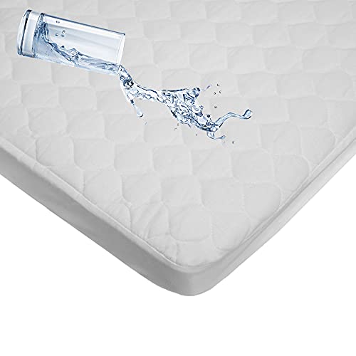 The waterproof fitted portable/mini size fitted mattress cover has a top layer of 100% cotton all over quilted pattern for baby’s comfort. The middle layer is soft polyester filler with a waterproof back layer. This pad cover measures 24” x 38” with 5” pockets with elastic all around provides a snug and secure fit on the mattress machine wash cold with like colors and use non-chlorine bleach if necessary. Tumble dry low for best results.