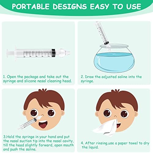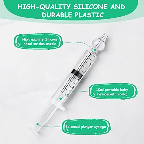 【Easy to use】Take out the nasal aspirator and silicone nasal suction head. Rinse with the included cleaning brush and draw adjusted saline solution into the irrigator. Simply screw back the nasal tip for re-use. The silicone nasal tip and portable irrigator make it easier to suck snot out of baby girl or baby boy noses.