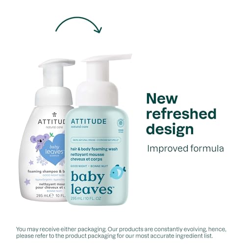 ATTITUDE 2-in-1 Hair and Body Foaming Wash for Baby, EWG Verified, Dermatologically Tested, Made with Naturally Derived Ingredients, Vegan, Good Night, 10 Fl Oz
