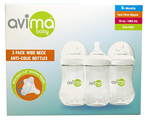 Avima 12 oz Anti Colic Infant Bottles, BPA Free, Wide Neck with Fast Flow Nipples (Set of 3)