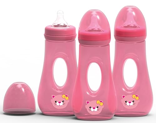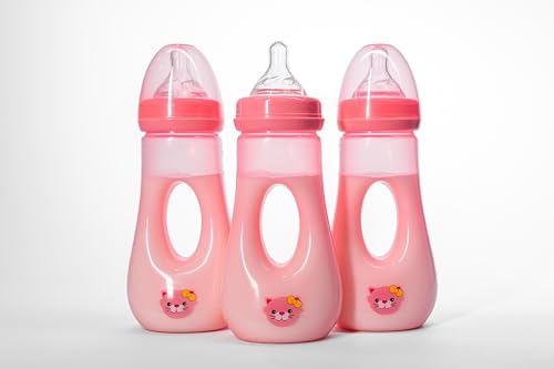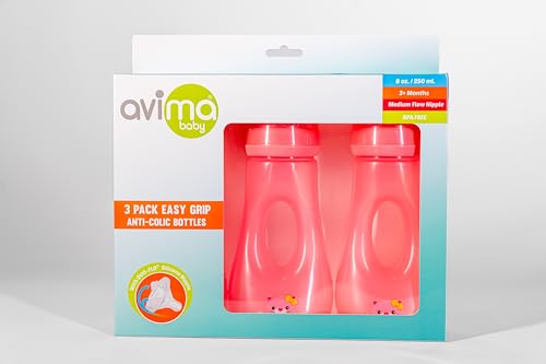 Avima Easy Grip Anti Colic Baby Bottles, BPA Free, 8 oz. Wide Neck with Medium Flow Silicone Nipples, Pink (Pack of 3)