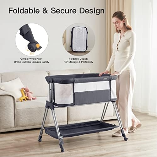 Baby Bassinets,Bedside Sleeper for Baby, Easy Folding Bedside Crib 7 Height Adjustable with All Mesh Baby Bed for Infant Newborn Girl Boy (Dark Grey)