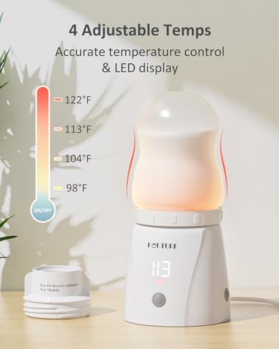 【4 Temps Setting & Always Accurate】The baby bottle warmer has 4 adjustable temperature settings (98°F, 104°F, 113°F, 122°F), which are clearly displayed on the LED screen. It auto-shuts off when the milk reaches the desired temperature, and keeps the milk warm for 30 minutes, perfect for busy caregiving or pre-preparation.