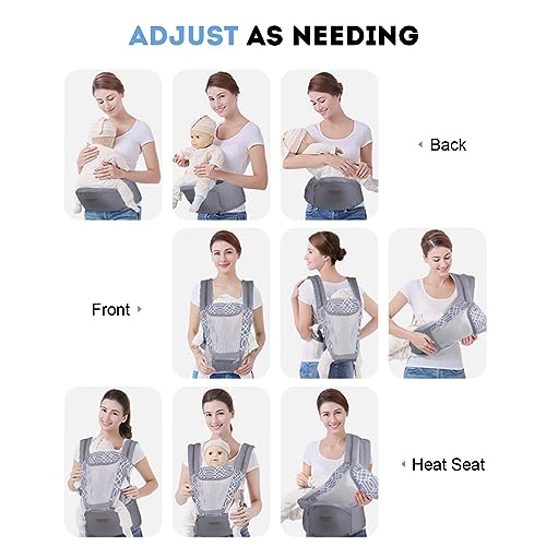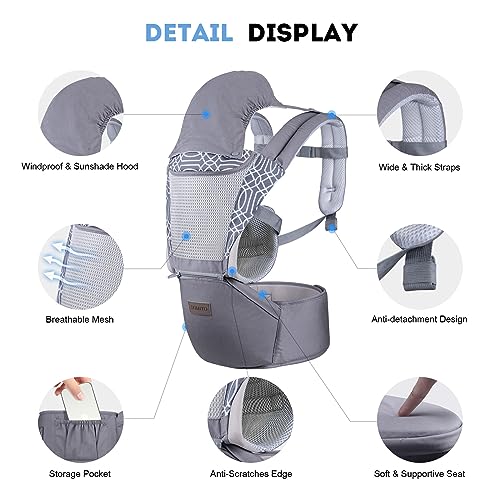 Baby Carrier Newborn to Toddler with Hip Seat Breathable Ergonomic 6 in 1 Baby Hip Seat Carrier with Hood & Extra Safety Belt Breastfeeding & Infant Carrier Soft Baby Holder Carrier for All Seasons