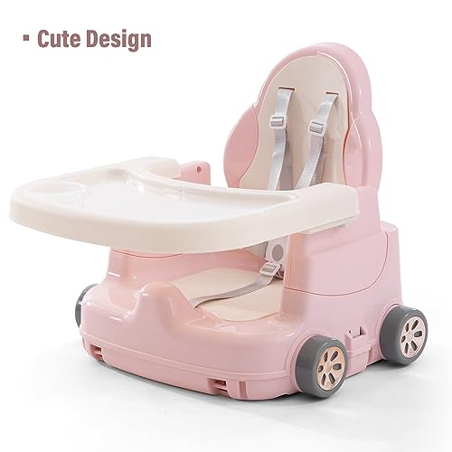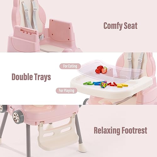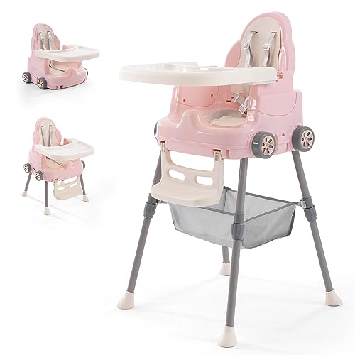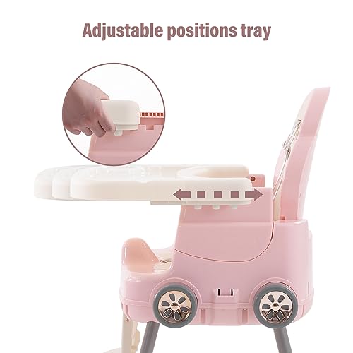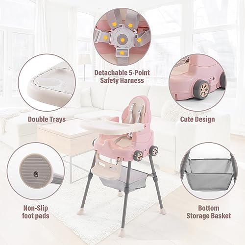 Baby High Chair,Adjustable Convertible 3 in 1 Baby High Chairs Baby Toddlers Feeding Chair Booster,5-Point Harness,Removable Tray&PU Cushion (Deep Pink)
