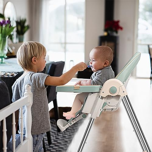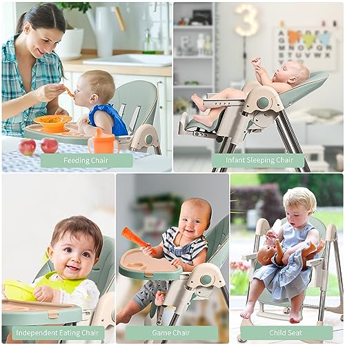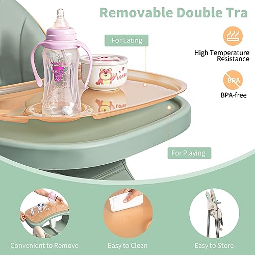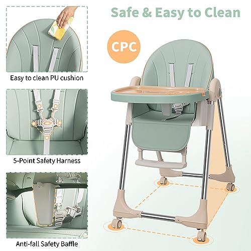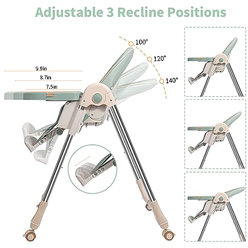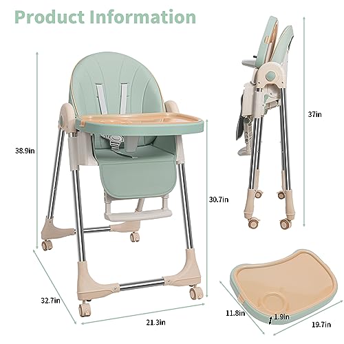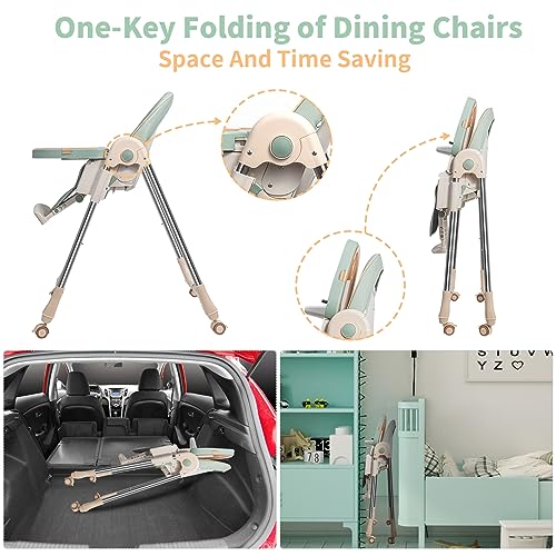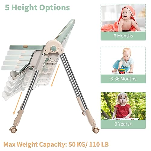Baby High Chairs for Babies and Toddlers with Adjustable Backrest/Footrest/Seat Height,Foldable High Chair with 4 Wheels, Toddler High Chair with Double Removable Tray, Baby Feeding Chair Bearing 50KG