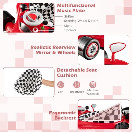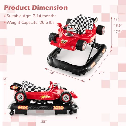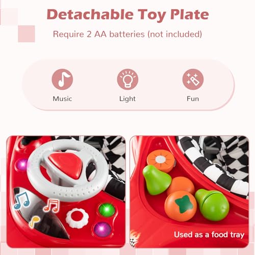 【Fun & Interactive Activity Center】 BABY JOY 4-in-1 Racing Car Walker takes your baby from stumbling steps to the fast lane of growth and witness them become winners on their own life path. The steering wheel, shifter, rear-view mirrors and light buttons satisfy your baby’s curiosity for exploration and early learning. And the music keeps the fun going. Requires 2 AA batteries (not included).