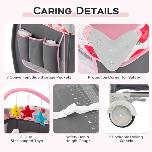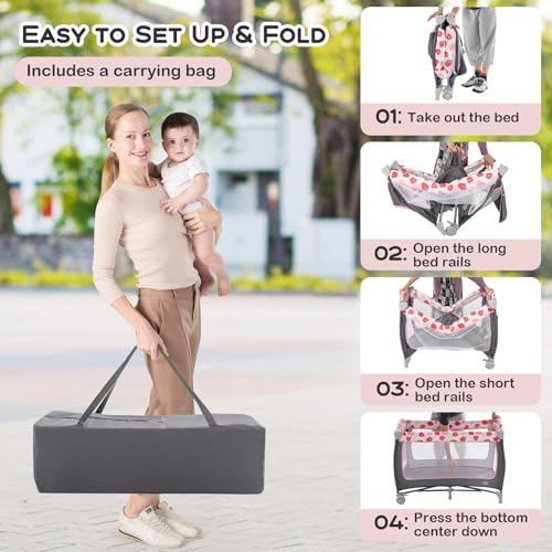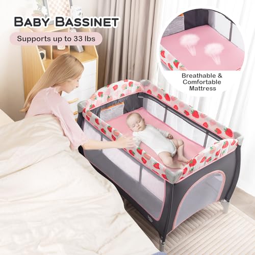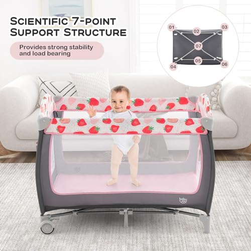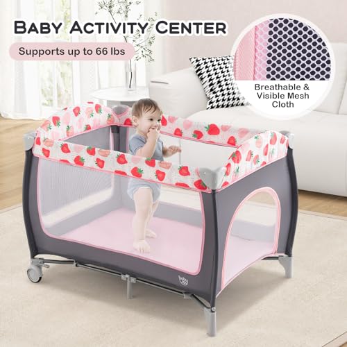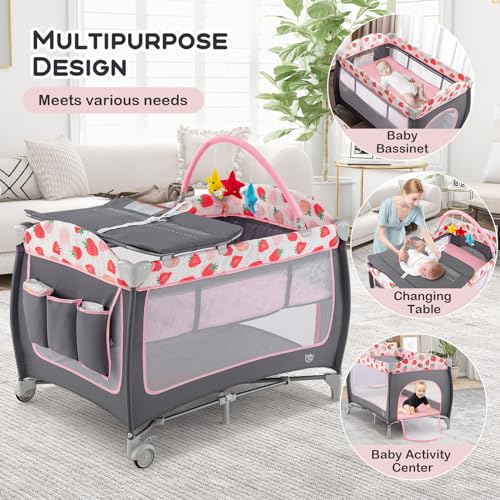 BABY JOY 4 in 1 Pack and Play, Portable Baby Playard with Bassinet, Side Zipper Door, Changing Table, Indoor Outdoor Travel Nursery Center w/Toy Bar, Lockable Wheels, Carry Bag