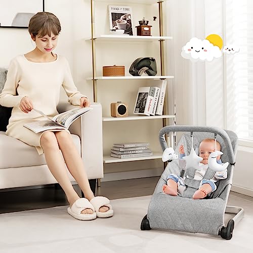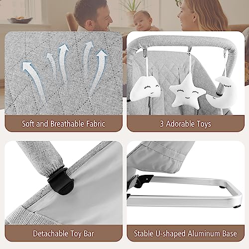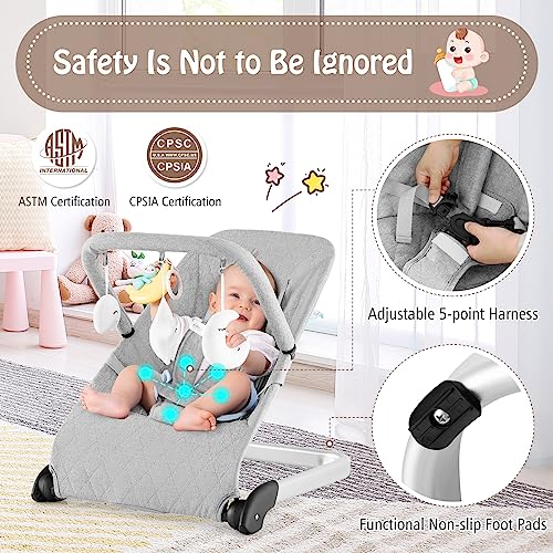 BABY JOY Baby Bouncer, Foldable Baby Rocker & Stationary Seat with 5-Point Safety Harness, Removable Fabric Cover & 3 Plush Toys, Portable Bouncer for Newborns Baby 0-6 Months (Grey)