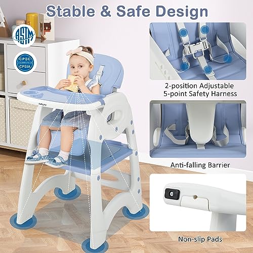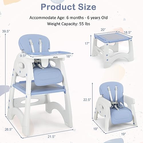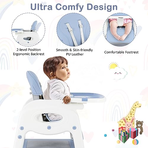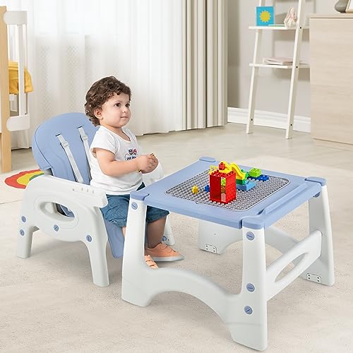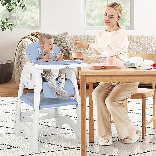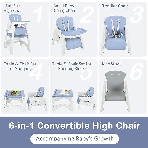 BABY JOY Baby High Chair, 6 in 1 Convertible Highchair for Babies & Toddlers, Booster Seat, Table and Chair Set, Building Block Table, Adjustable Backrest, Removable Double Tray, Safety Harness (Blue)