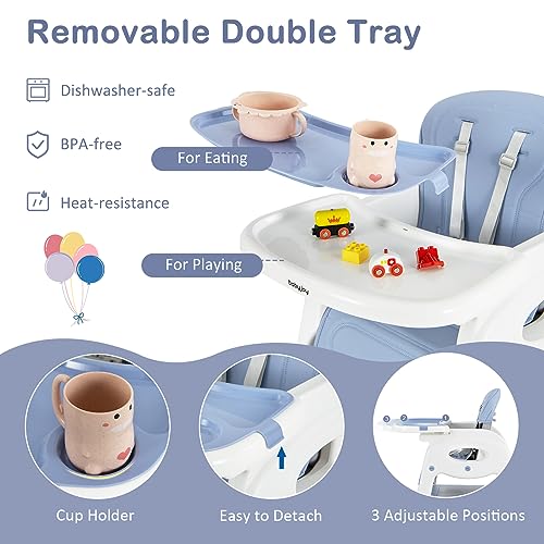 ❤️Adjustable Seat Back & Trays: Our high chair is designed with a 2-position reclining backrest for different usage needs. The removable PU seat cushion has a soft and skin-friendly surface. In addition, the tray can be adjusted in 3 positions to provide more space and flexibility for fast-growing children.