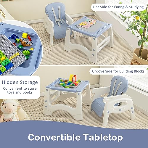❤️Reversible Tabletop with Storage: The tabletop features a double-sided design, which offers a flat surface for regular use, while the other side is thoughtfully designed for building blocks. In addition, the high chair has a storage compartment underneath the tabletop for kids to organize their toys.