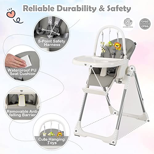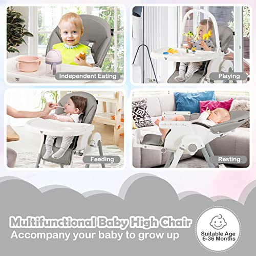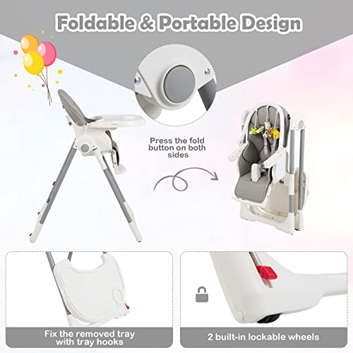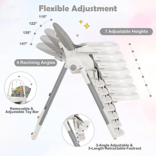 BABY JOY Baby High Chair, Foldable Highchair w/Toy Bar, 7 Heights, 4 Reclining Angles, Adjustable Footrest, Removable Double Tray, PU Cushion & Lockable Wheels for Babies Toddlers, 6-36 Months (Gray)