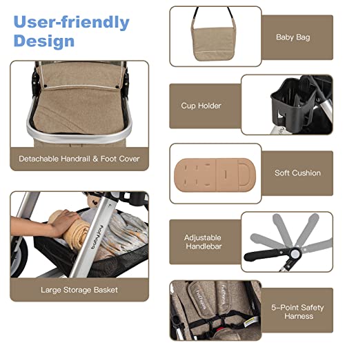 BABY JOY Baby Stroller, 2-in-1 Convertible Bassinet Reclining Stroller, Foldable Pram Carriage with 5-Point Harness, Including Cup Holder, Foot Cover, Diaper Bag, Aluminum Structure, Khaki