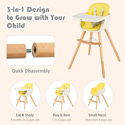 BABY JOY Convertible Baby High Chair, 3 in 1 Wooden Highchair/Booster/Chair with Removable Tray, Adjustable Legs, 5-Point Harness, PU Cushion and Footrest for Baby, Infants, Toddlers (Yellow)