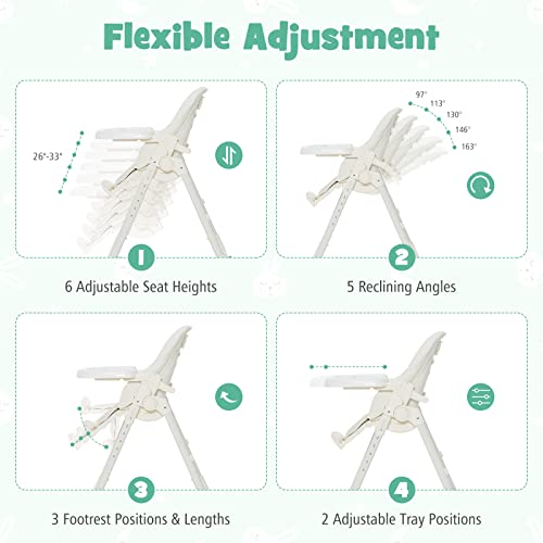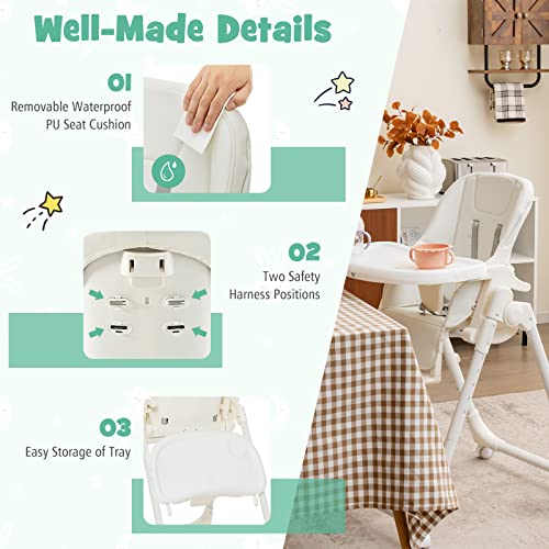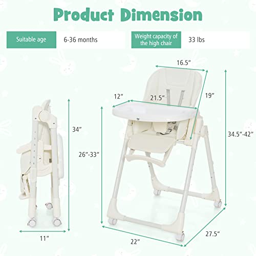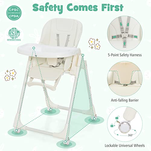 BABY JOY High Chair for Babies & Toddlers, Foldable Highchair with Adjustable Backrest, Footrest and Height, Removable Tray, Detachable Seat Cushion, 4 Lockable Wheels (Beige)